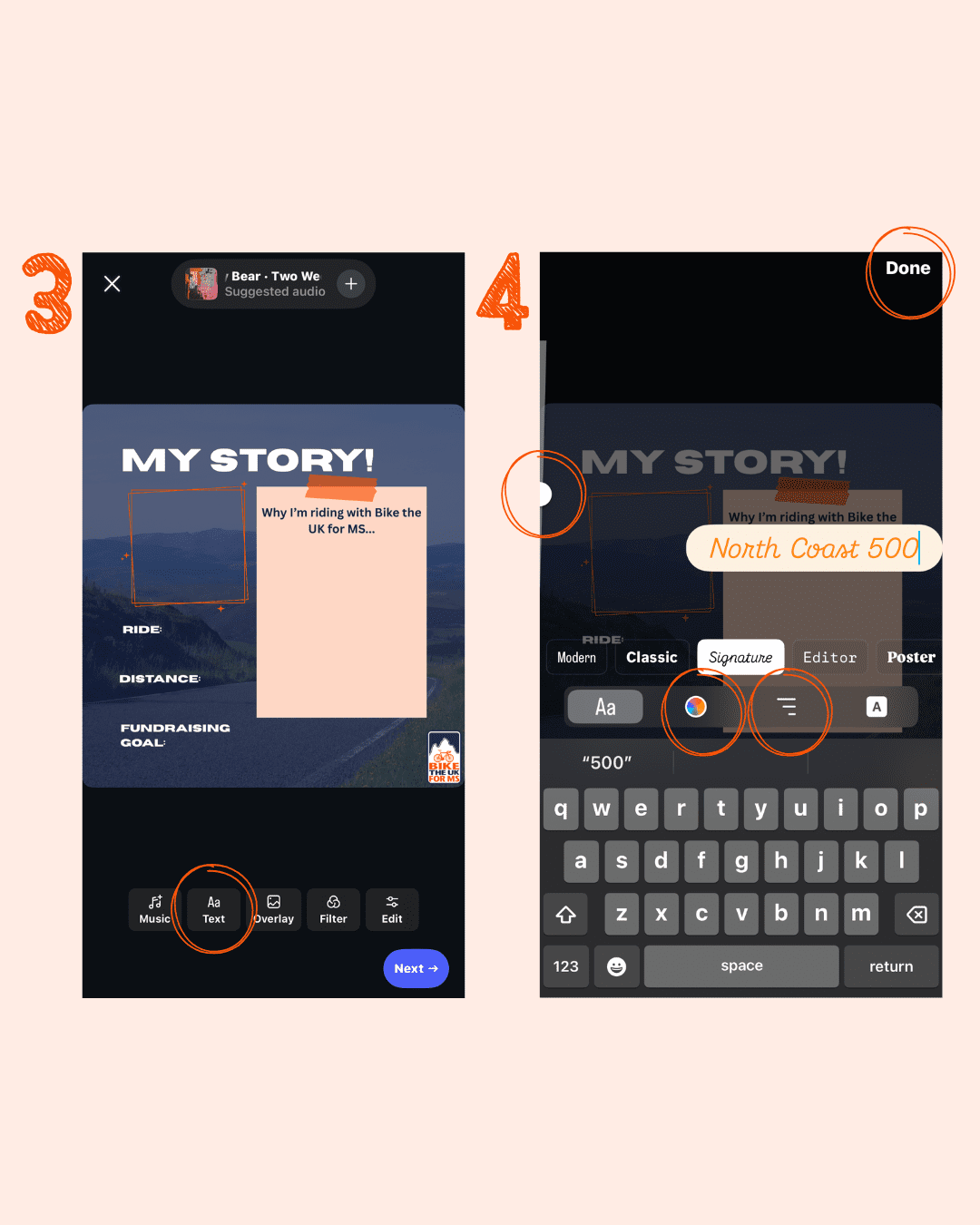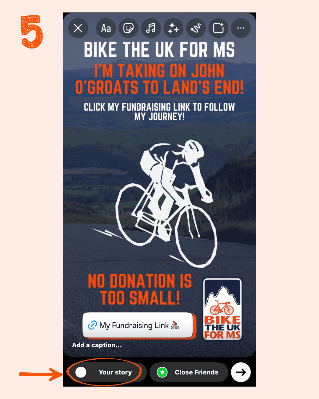 • Fill in your link → Customise sticker text → Type in what you want the sticker to say (e.g. My fundraising link 🚴‍♀️) → Click ‘Done’