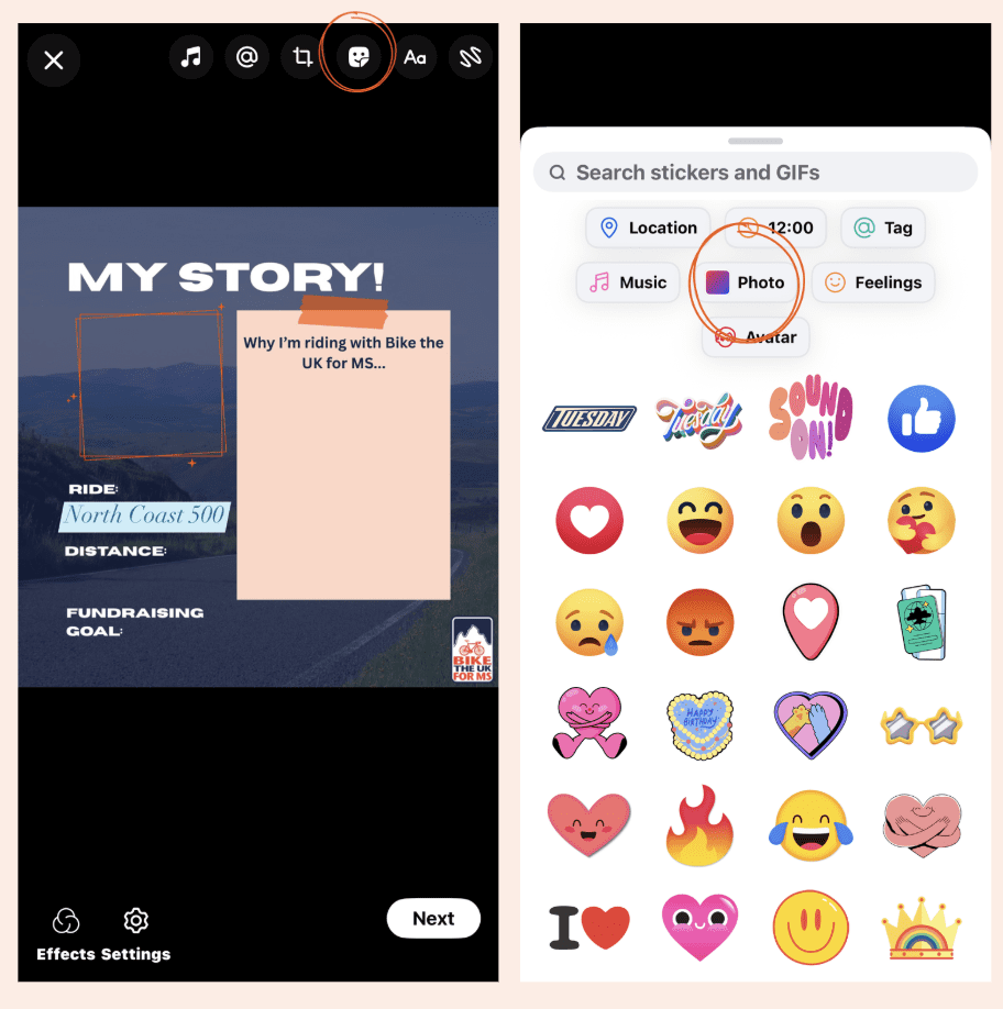 • Tap the square smiley face sticker icon → ‘Photo’ → Select photo from camera roll → Pinch it to resize and move to the photo frame in the top left.